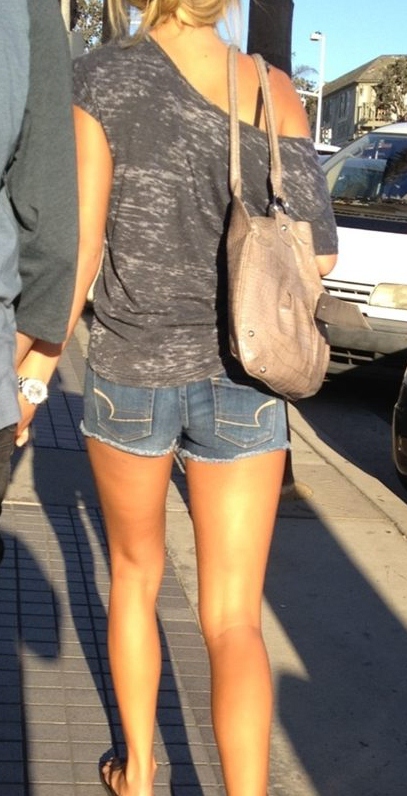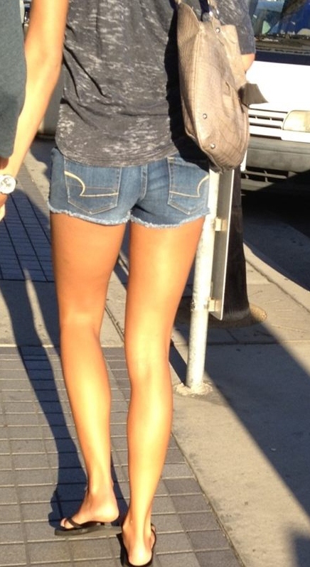 Long, thin, sexy legs to wrap around you. Poor sap boy friend had no idea his leggy girl was being creeped.